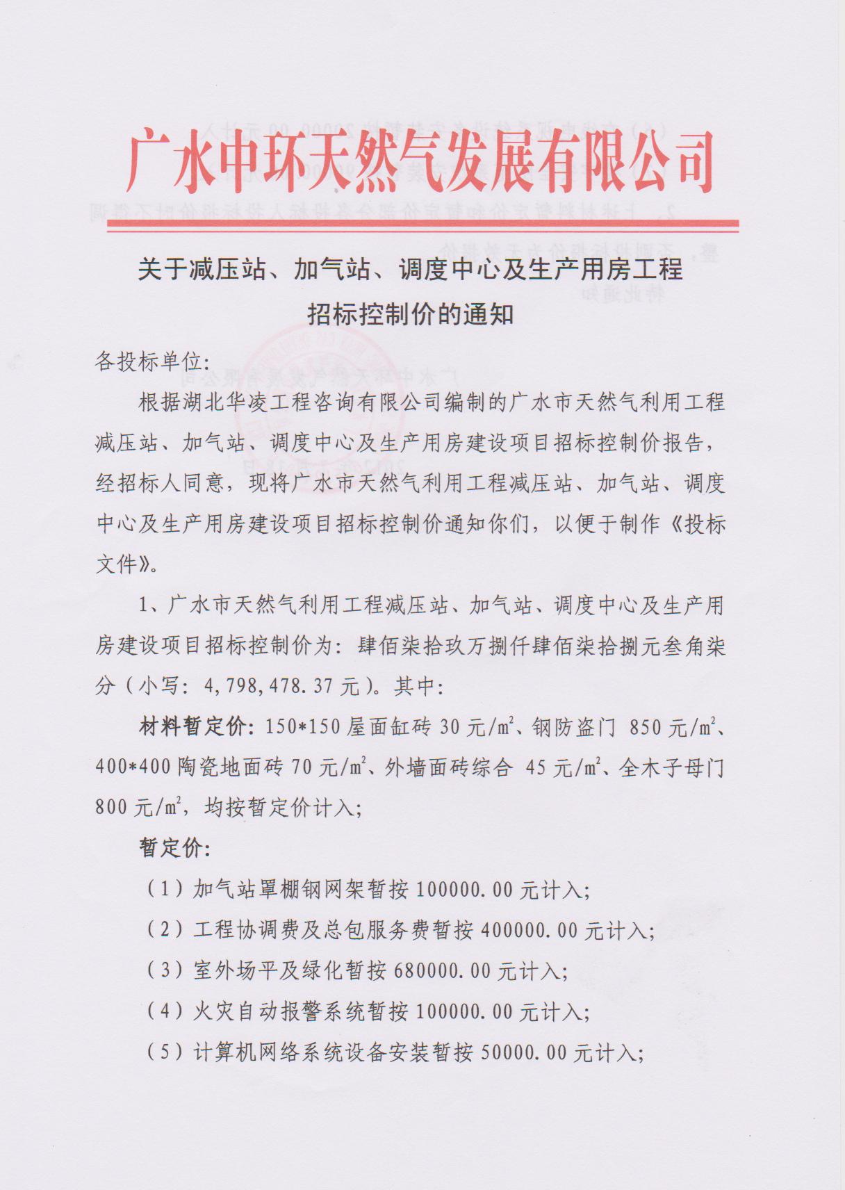 關(guān)于減壓站、加氣站、調(diào)度中心及生產(chǎn)用房工程招標控制價的通知